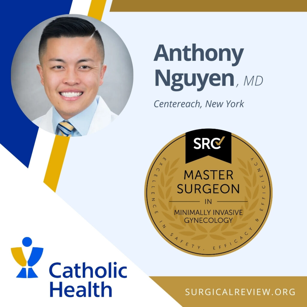 Anthony Nguyen, MD has been accredited as an SRC Master Surgeon in Minimally Invasive Gynecology. Dr. Nguyen practices at Good Samaritan University Hospital and the Catholic Health Minimally Invasive Gynecologic Surgery Commack and Centereach locations in New York.