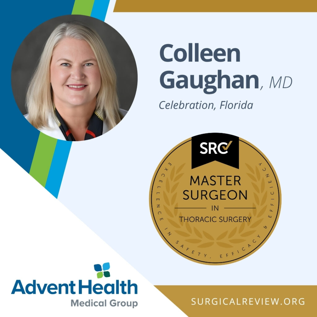 Colleen Gaughan, MD has been accredited as an SRC Master Surgeon in Thoracic Surgery. Dr. Gaughan practices at AdventHealth Celebration and AdventHealth Medical Group Thoracic Surgical Oncology at Celebration in Celebration, Florida.